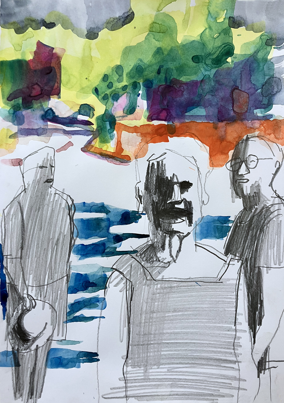 Seit 10 Jahren bin dabei, als Dozent für die Zeichnerei an der Abendschule der HBKsaar. Im Sommer zeichne ich mit meinen Teilnehmer:innen draußen in der großen Stadt; im Winter zeichnen wir drinnen, meistens Menschen.