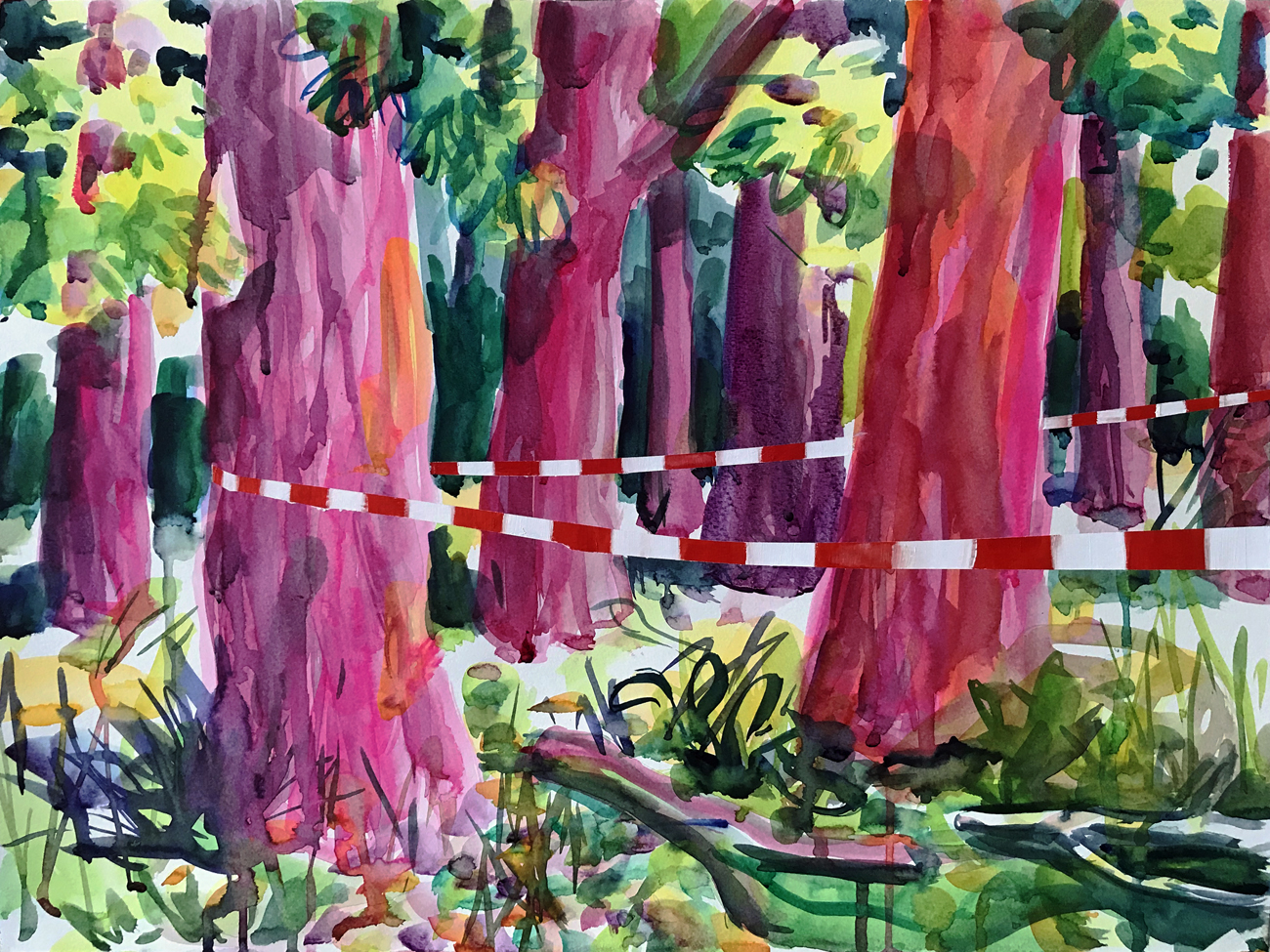 Ausgangspunkte waren der magentafarbene Baum in der Mitte, der blaue Baumstumpf links des Baumes sowie die beiden größeren Bäume auf der linken Seite des Bildes. Danach ließ ich es laufen; alle weiteren Zutaten sprießten ohne mein Zutun, ich war lediglich Beobachter des Vorgangs. Einzig die drei Protagonisten der Situation bedurften meines zaghaften Eingreifens auf der opulenten Naturbühne. Größe & Position der Akteure waren das Ergebnis mehrerer Proben. Irgendwie musste ich immer wieder an jenen Film denken. High Noon in the forest.
