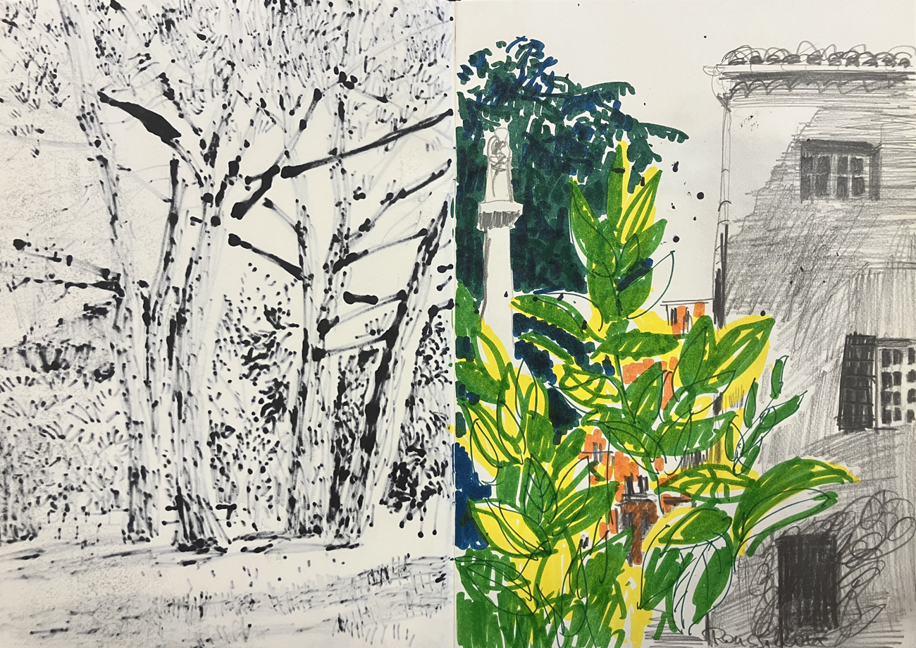 Bleistift, Buntstift, Filzstift in Skizzenbuch, 29,7 x 42 cm (geöffnet)